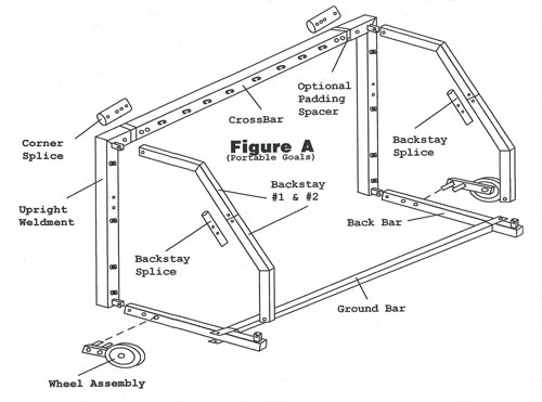 ATTENTION: There is a LEFT UPRIGHT WELDMENT and a RIGHT UPRIGHT WELDMENT. The welded attachment channel used to attach backstay to Upright should face up toward sky (see figures A & B) Additionally, if you purchased upright padding with your soccer goal(s) be sure to include the padding spacer as shown in the diagram. NOTE: IF YOU DO NOT PLAN TO PAD SOCCER UPRIGHTS, DO NOT USE PADDING SPACERS!