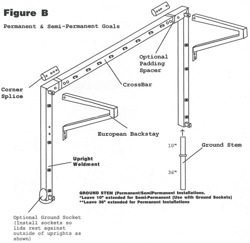 (Semi-Permanent Installers may now open GROUND SOCKETS and insert GROUND STEM/UPRIGHT assembly into SOCKETS) Place EUROPEAN BACKSTAY into mounting channel on UPRIGHT WELDMENT as shown in Figure B and secure each side using (1) 3/8” x 3” hex bolt, (2) 3/8” flatwashers, (1) 3/8” lockwasher and (1) 3/8” hex nut. |