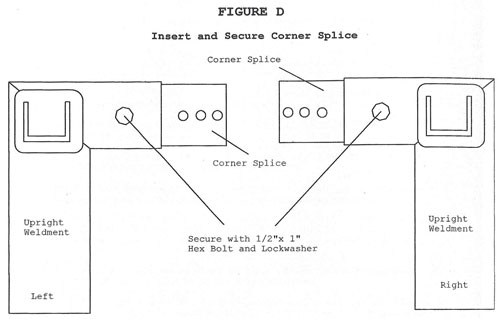 First, using (2) ½”x 1” hex bolts and (2) ½” lockwashers, secure (1) Corner Splice into each Upright as shown in Figure D. (Use 1 hex bolt and lockwasher on each Corner Splice) Note: The Corner Splice is a tight fit, some paint may scrape off when inserting Corner Splice into Upright. |