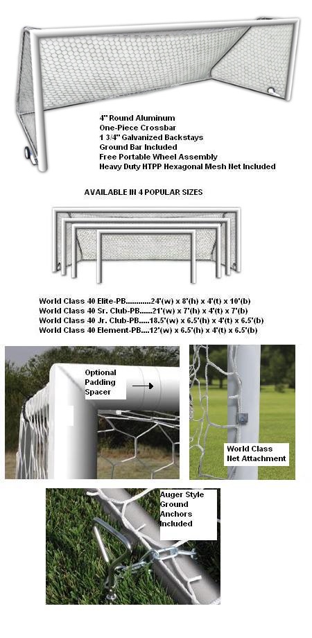 The World Class line of portable aluminum soccer goals sets a new standard in the soccer industry for durability, dependability, portability and safety. No other line of soccer goals offers all of the built in features included with these units.